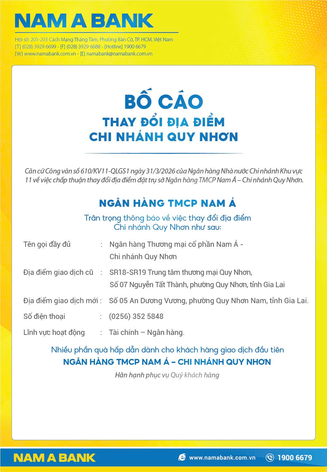 BỐ CÁO THAY ĐỔI ĐỊA ĐIỂM NAM A BANK QUI NHƠN