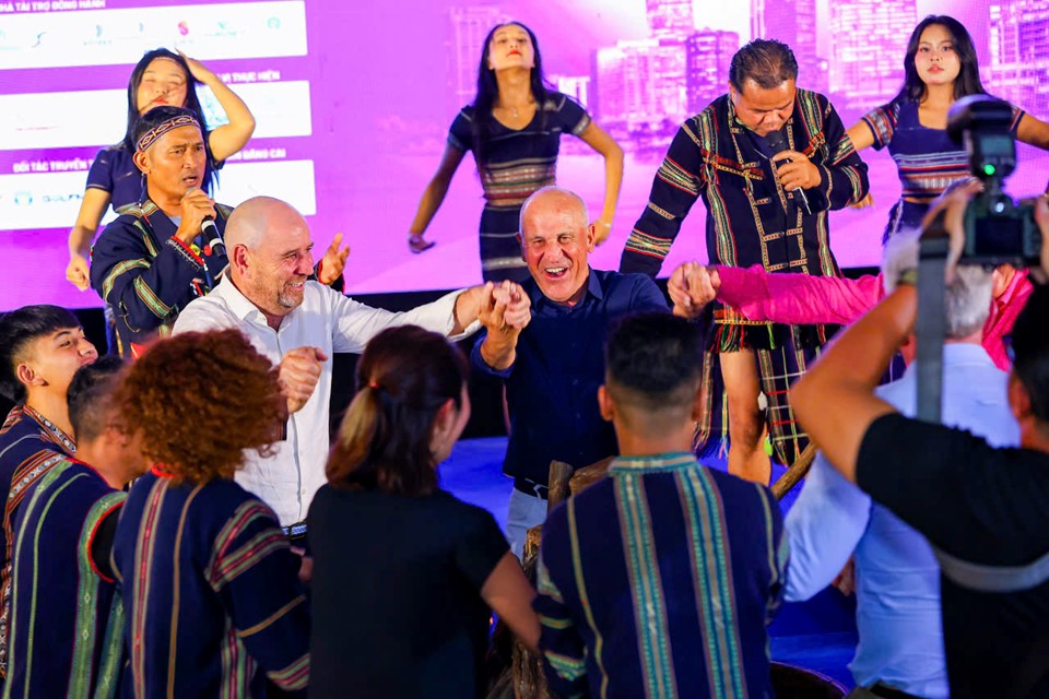 Đêm xuống, cao nguyên Đà Lạt trở nên rộn ràng hơn với tiếng cồng chiêng Tây Nguyên. Những điệu múa, lời ca, ánh lửa bập bùng cùng nụ cười mến khách đã tạo nên một bữa tiệc văn hoá đầy sắc màu. Đó không chỉ là một chương trình biểu diễn nghệ thuật, mà còn là khoảnh khắc gắn kết, khi những huyền thoại thể thao và người dân bản địa cùng chia sẻ niềm vui trong âm nhạc và tình bằng hữu.