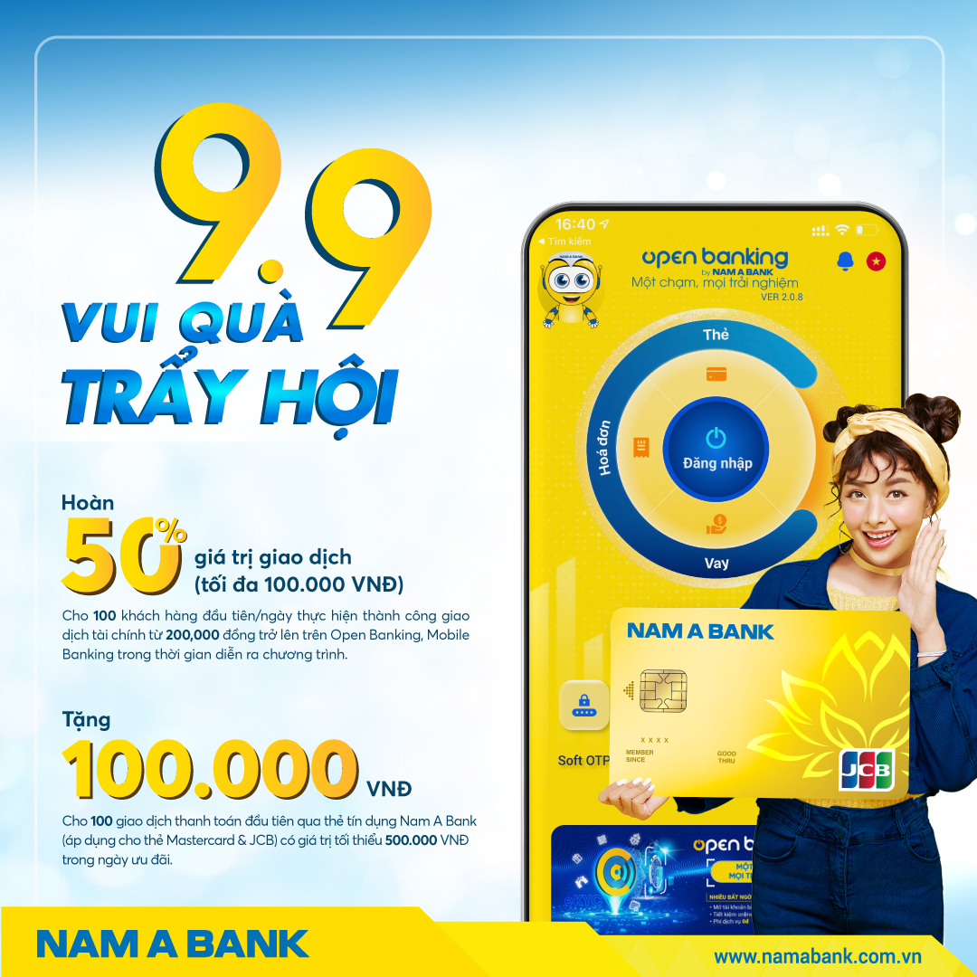 - Hoàn 50% giá trị giao dịch (tối đa 100,000 VNĐ) cho 100 khách hàng đầu tiên/ngày thực hiện thành công giao dịch tài chính từ 200,000 đồng trở lên trên Open Banking, Mobile Banking trong thời gian diễn ra chương trình.