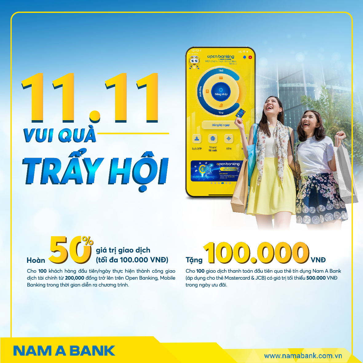 - Hoàn 50% giá trị giao dịch (tối đa 100,000 VNĐ) cho 100 khách hàng đầu tiên/ngày thực hiện thành công giao dịch tài chính từ 200,000 đồng trở lên trên Open Banking, Mobile Banking trong thời gian diễn ra chương trình.
