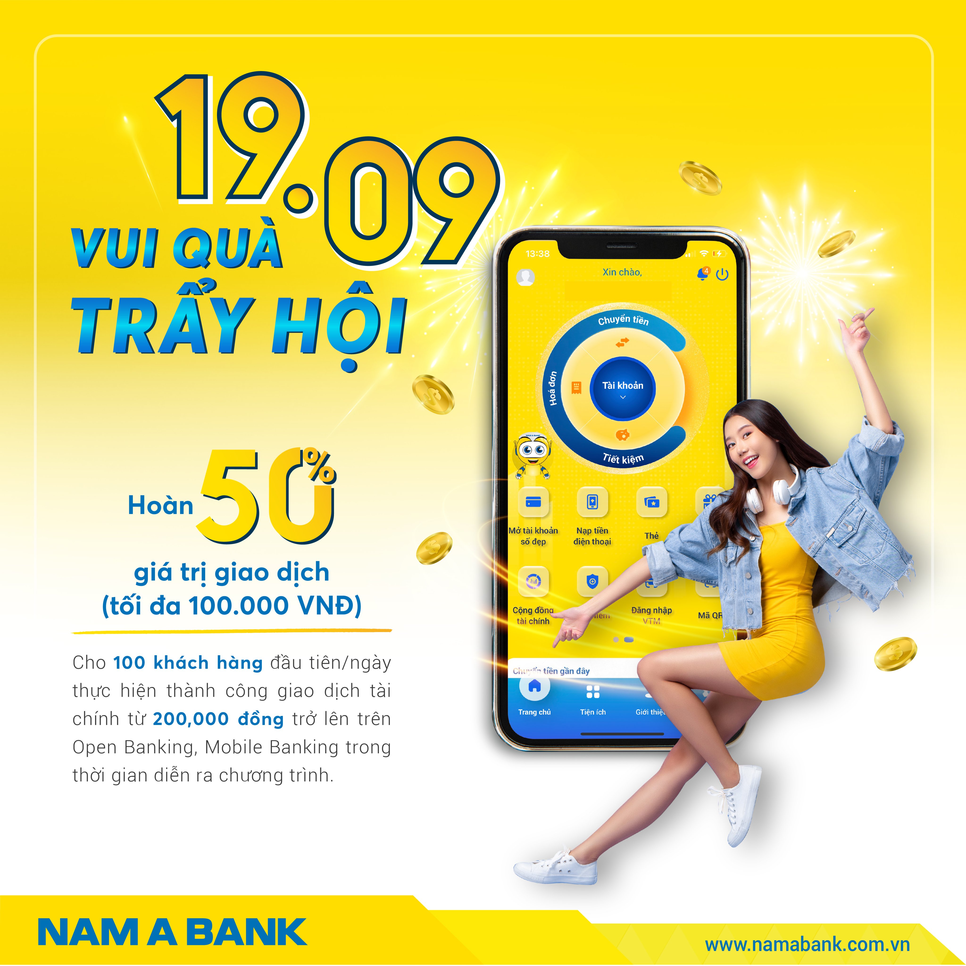 - Hoàn 50% giá trị giao dịch (tối đa 100,000 VNĐ) cho 100 khách hàng đầu tiên/ngày thực hiện thành công giao dịch tài chính từ 200,000 đồng trở lên trên Open Banking, Mobile Banking trong thời gian diễn ra chương trình.