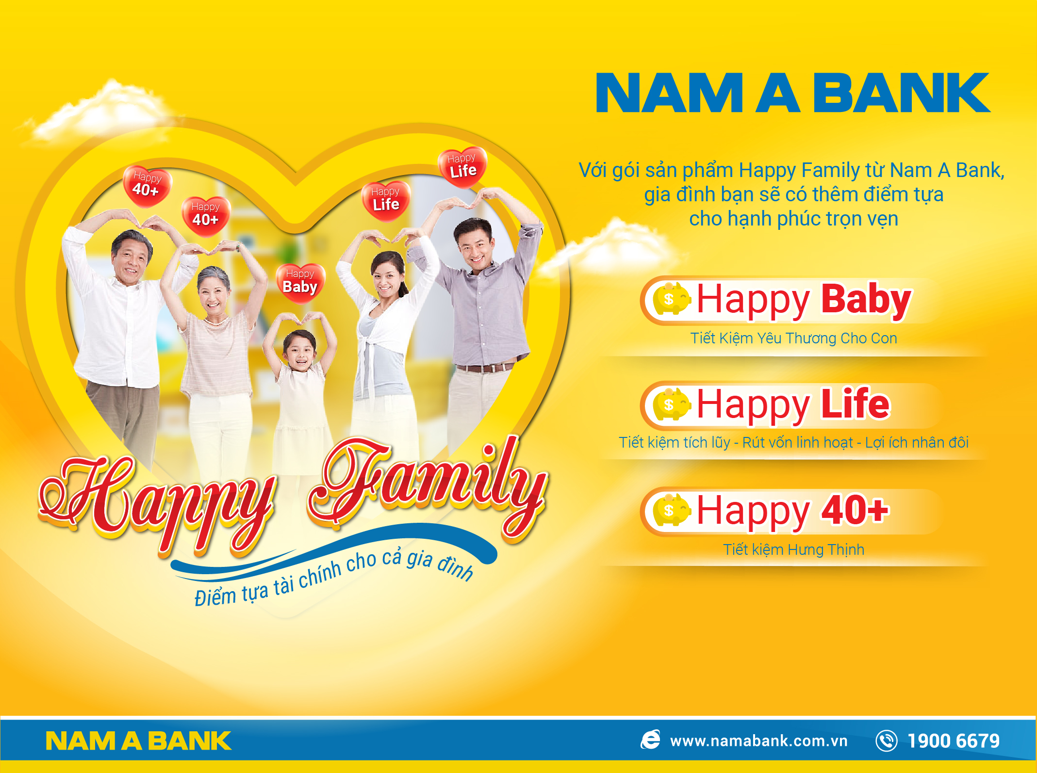 Năm 2019, Nam A Bank triển khai gói sản phẩm tiết kiệm toàn diện gồm 3 sản phẩm: Happy Baby, Happy Life và Happy 40+. Với lãi suất ưu đãi cùng nhiều tiện ích vượt trội, gói sản phẩm Happy Family hi vọng sẽ đồng hành cùng mọi gia đình Việt để mang đến cho bạn những giai đoạn đáng nhớ, hạnh phúc và đầy ắp tiếng cười.