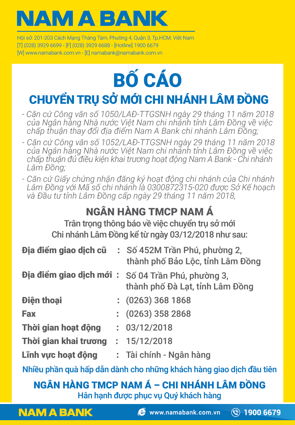 BỐ CÁO CHUYỂN TRỤ SỞ MỚI CHI NHÁNH LÂM ĐỒNG