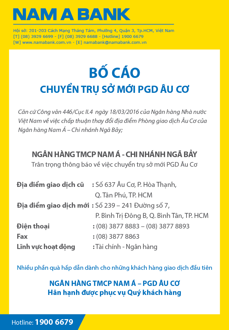 Bố cáo chuyển trụ sở mới PGD Âu Cơ