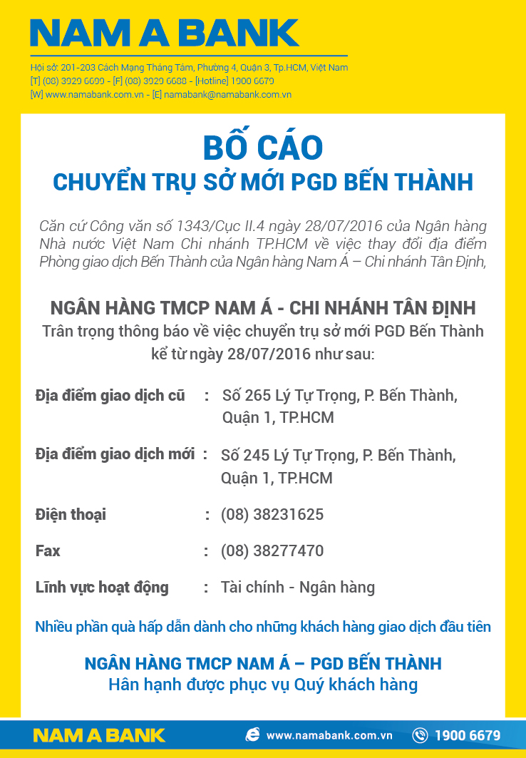 Bố cáo chuyển trụ sở mới PGD Bến Thành