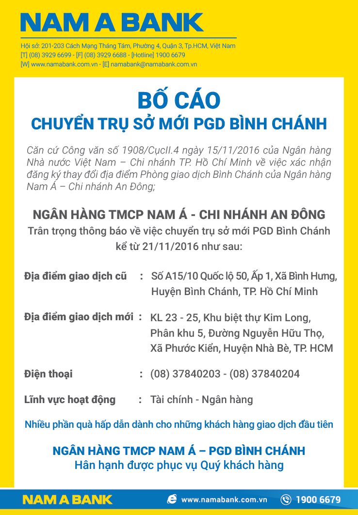 Bố cáo chuyển trụ sở mới PGD Bình Chánh