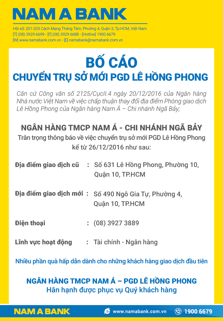 Bố cáo chuyển trụ sở mới PGD Lê Hồng Phong