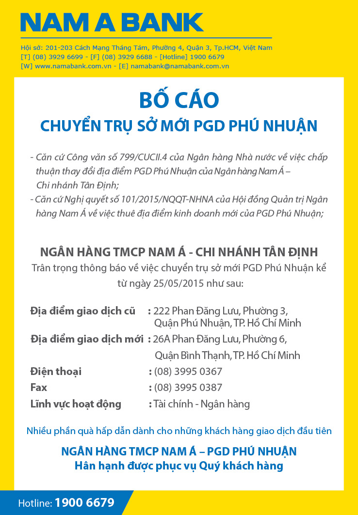 Bố cáo chuyển trụ sở mới PGD Phú Nhuận