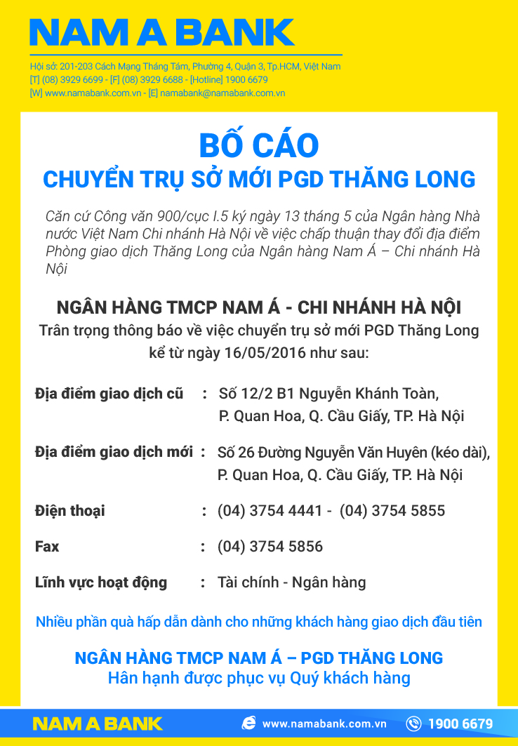 Bố cáo chuyển trụ sở mới PGD Thăng Long