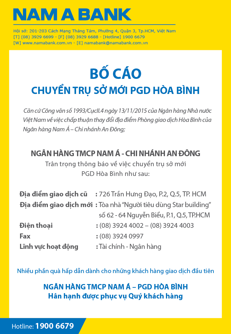 Bố cáo khai trương Nam A Bank Hòa Bình