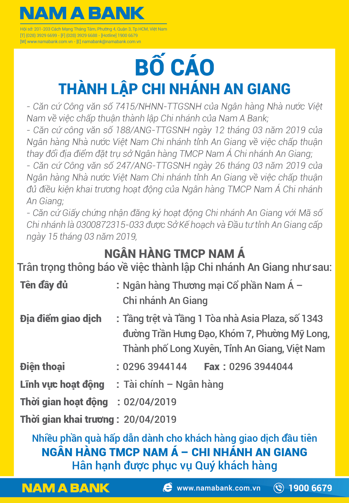 BỐ CÁO THÀNH LẬP CHI NHÁNH AN GIANG