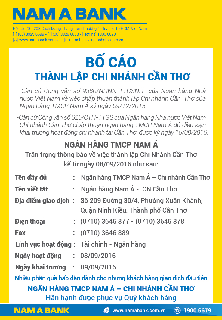 Bố cáo thành lập Chi nhánh Cần Thơ