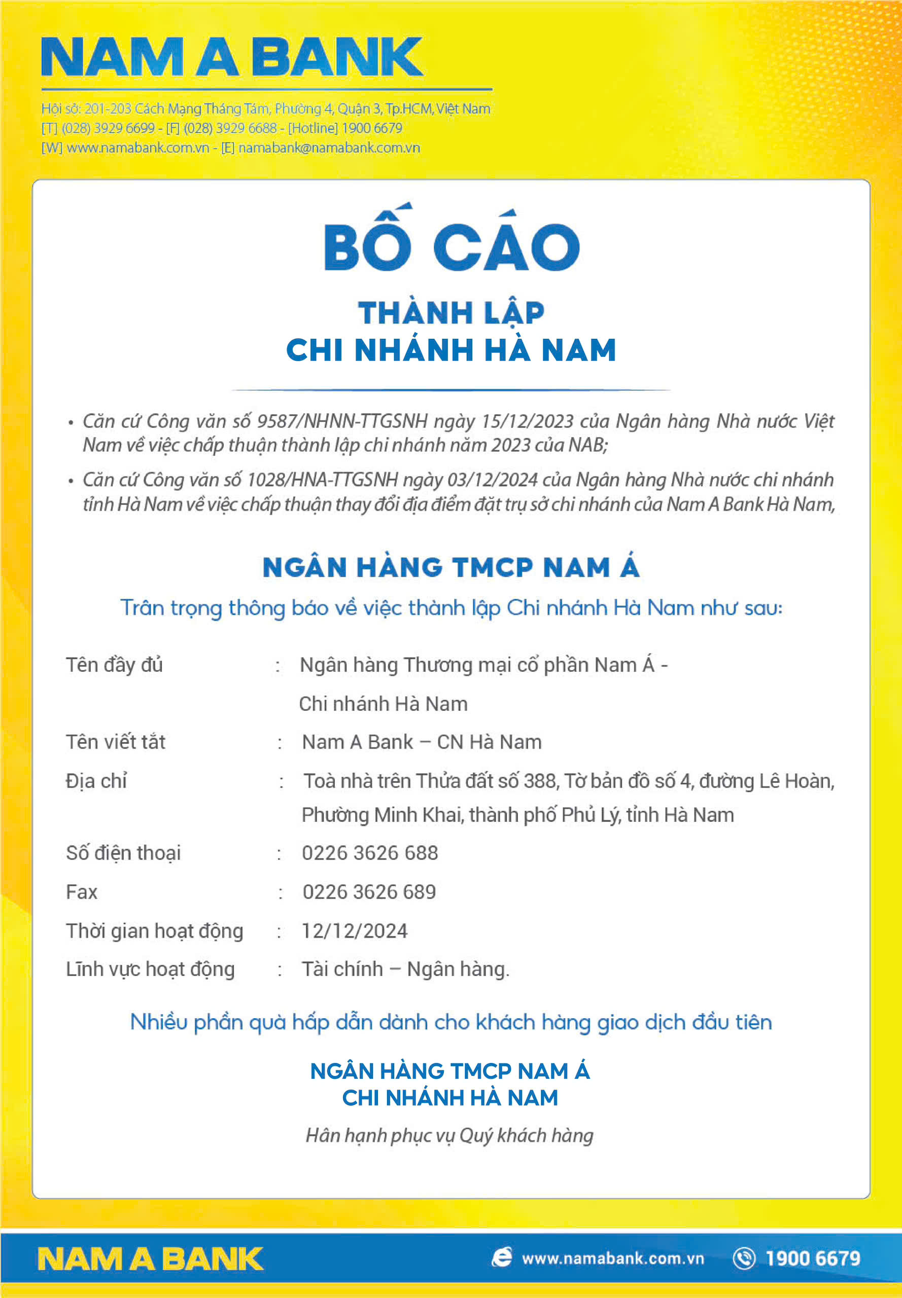 BỐ CÁO THÀNH LẬP CHI NHÁNH HÀ NAM