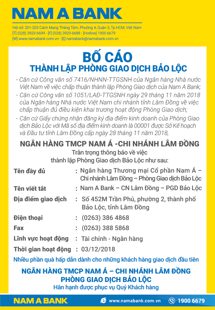 BỐ CÁO THÀNH LẬP PHÒNG GIAO DỊCH BẢO LỘC