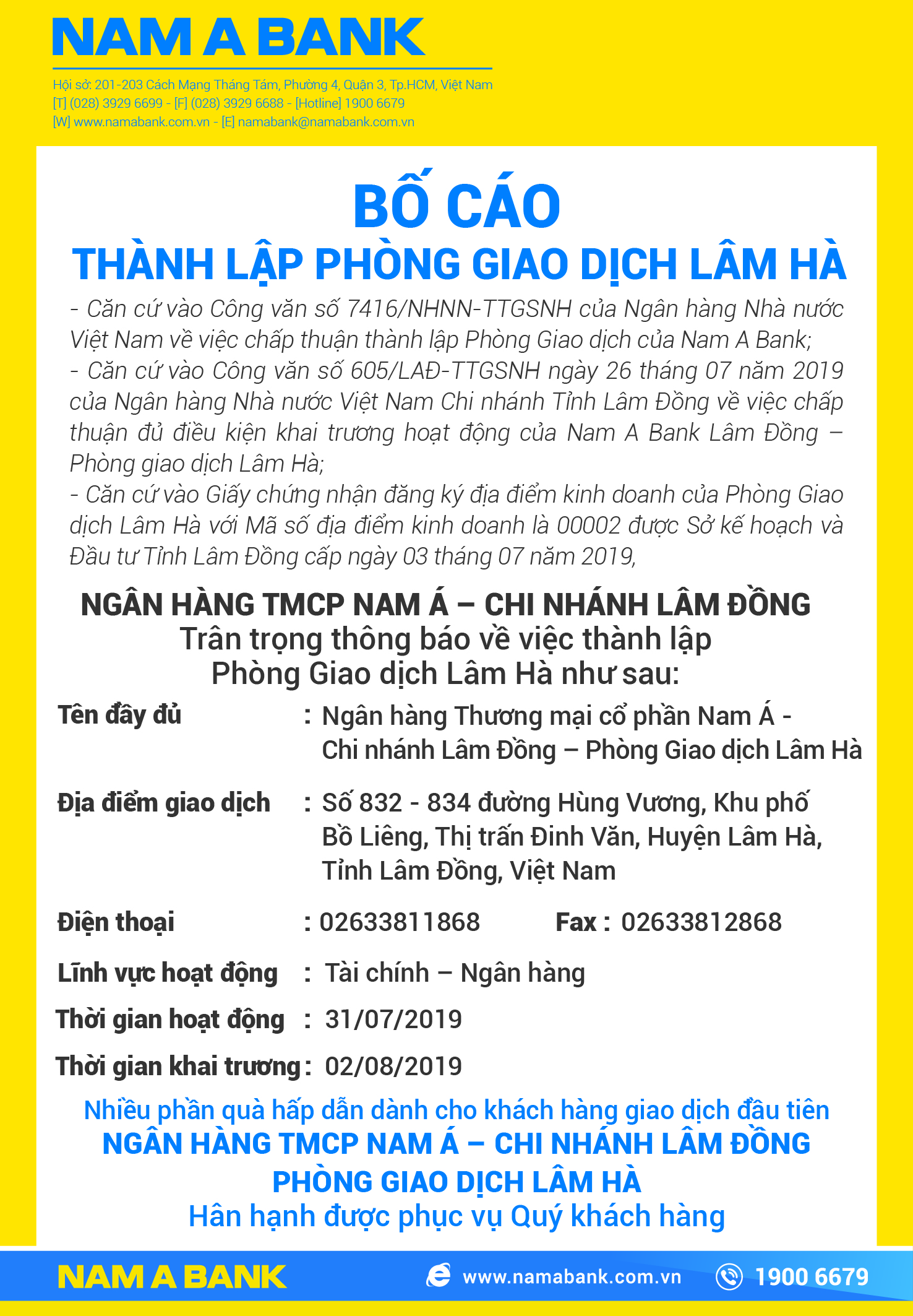 BỐ CÁO THAY ĐỔI ĐỊA ĐIỂM NAM A BANK - CN LÂM ĐỒNG