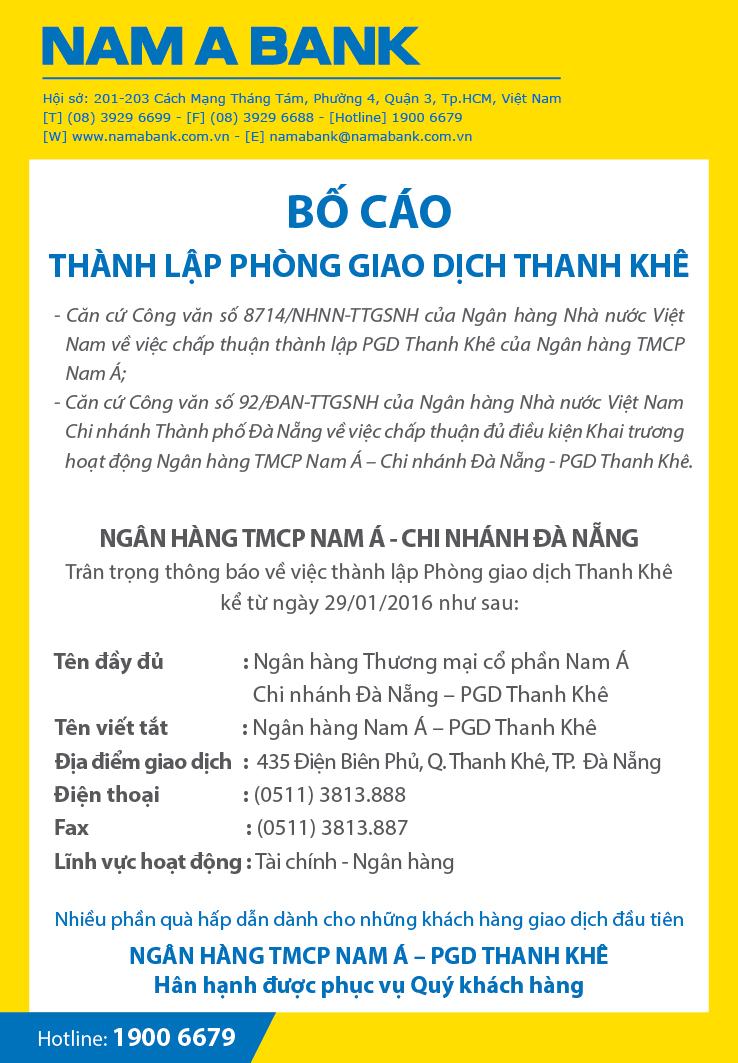 Bố cáo thành lập Phòng giao dịch Thanh Khê