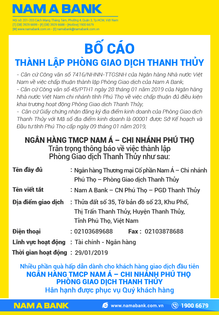 BỐ CÁO THÀNH LẬP PHÒNG GIAO DỊCH THANH THỦY