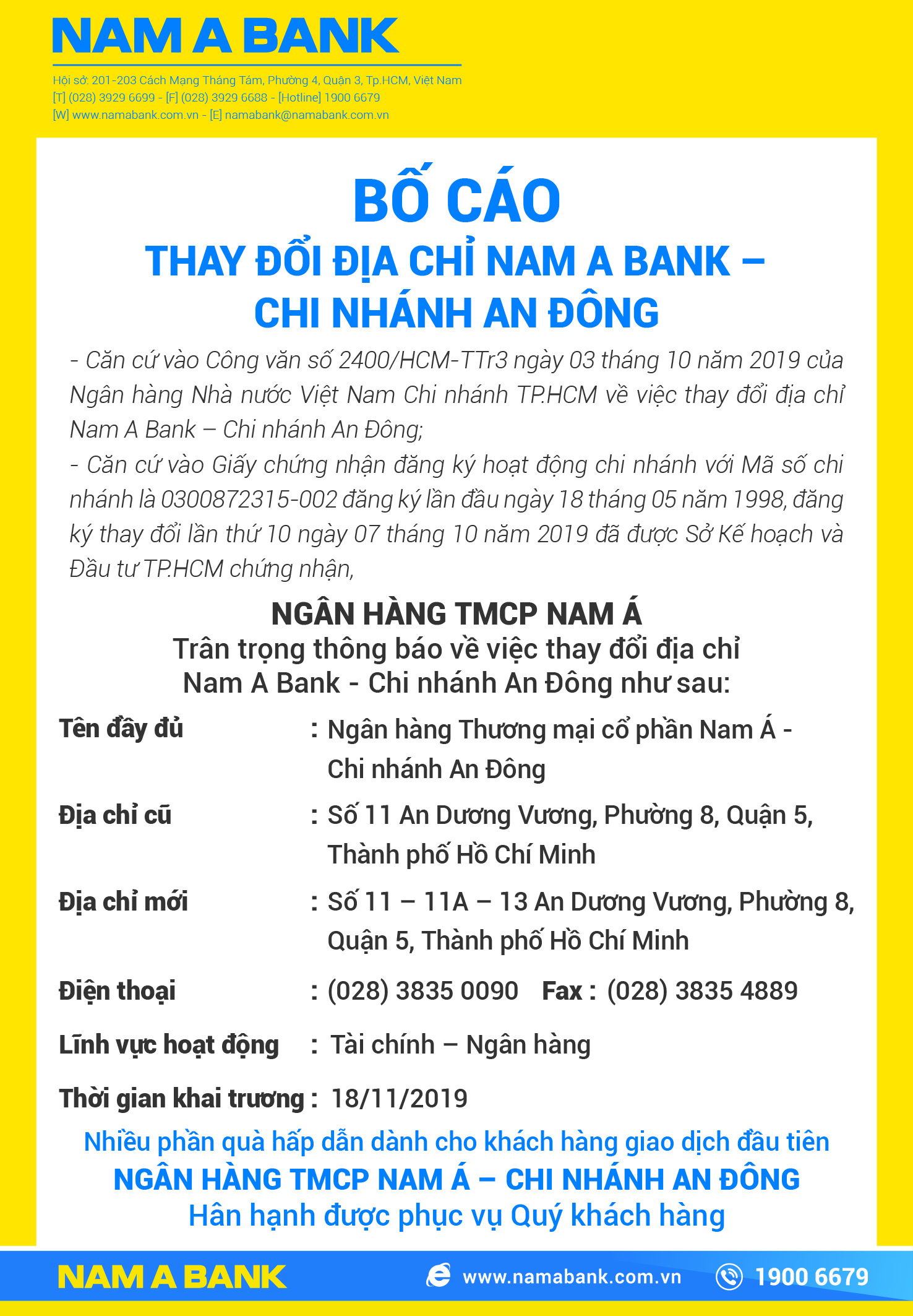 BỐ CÁO THAY ĐỔI ĐỊA CHỈ NAM A BANK - CHI NHÁNH AN ĐÔNG