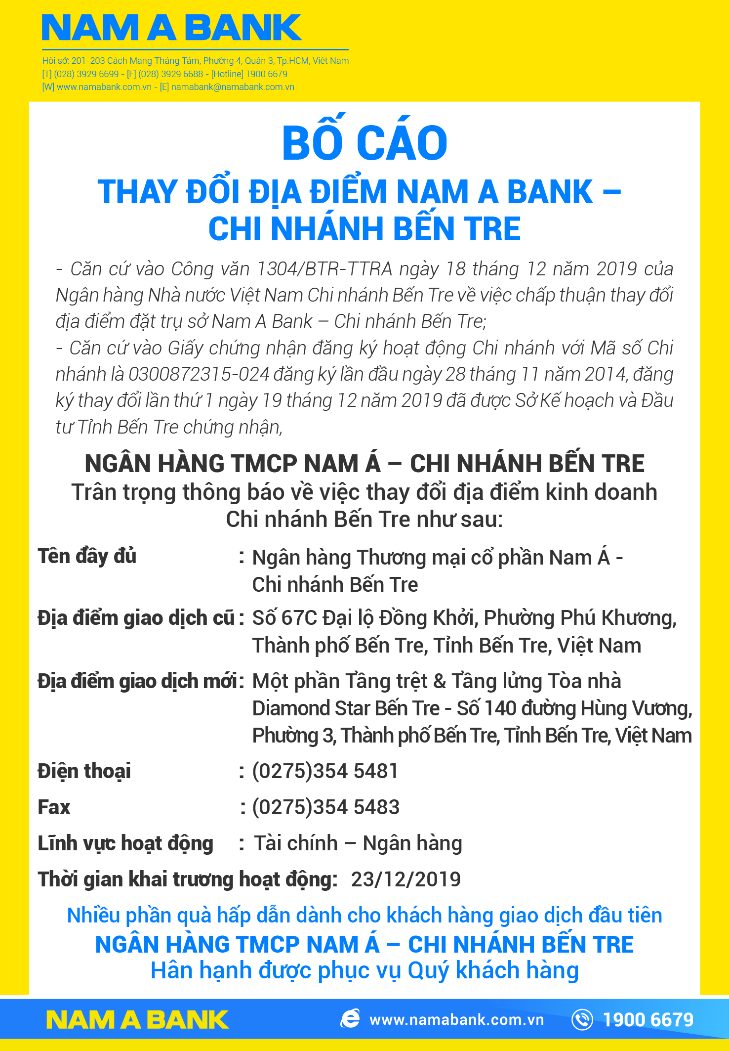 BỐ CÁO THAY ĐỔI ĐỊA ĐIỂM CHI NHÁNH BẾN TRE