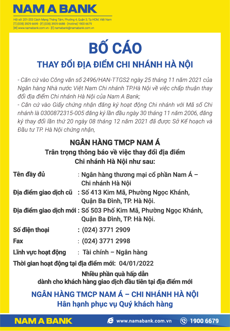 BỐ CÁO THAY ĐỔI ĐỊA ĐIỂM CHI NHÁNH HÀ NỘI