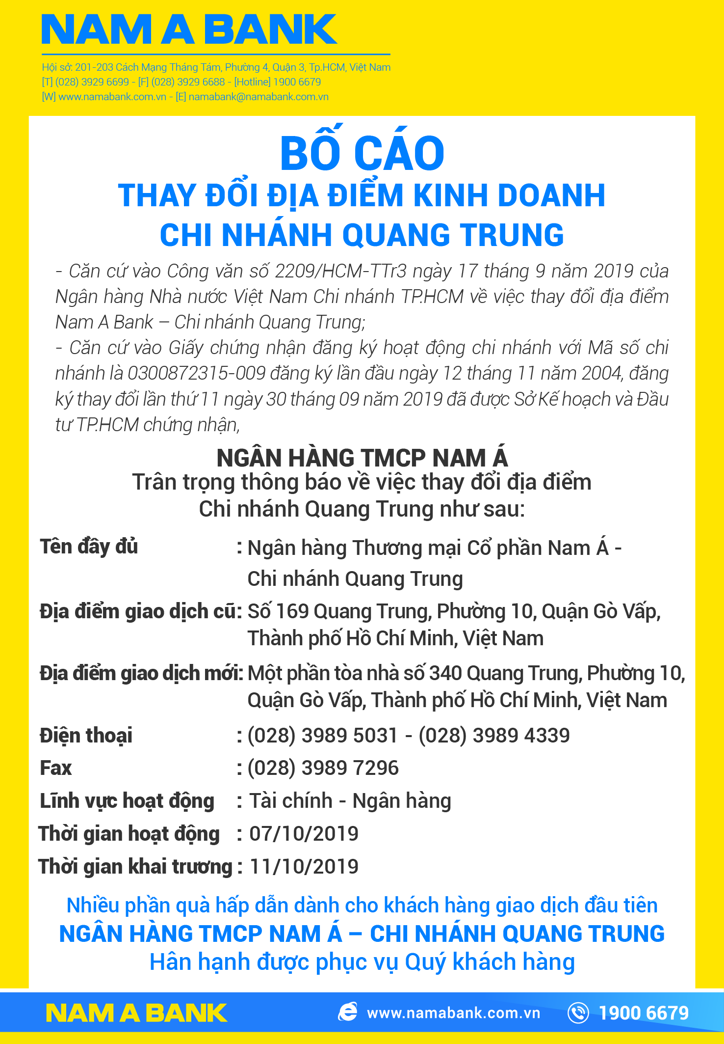 BỐ CÁO THAY ĐỔI ĐỊA ĐIỂM NAM A BANK - PGD ĐỨC TRỌNG