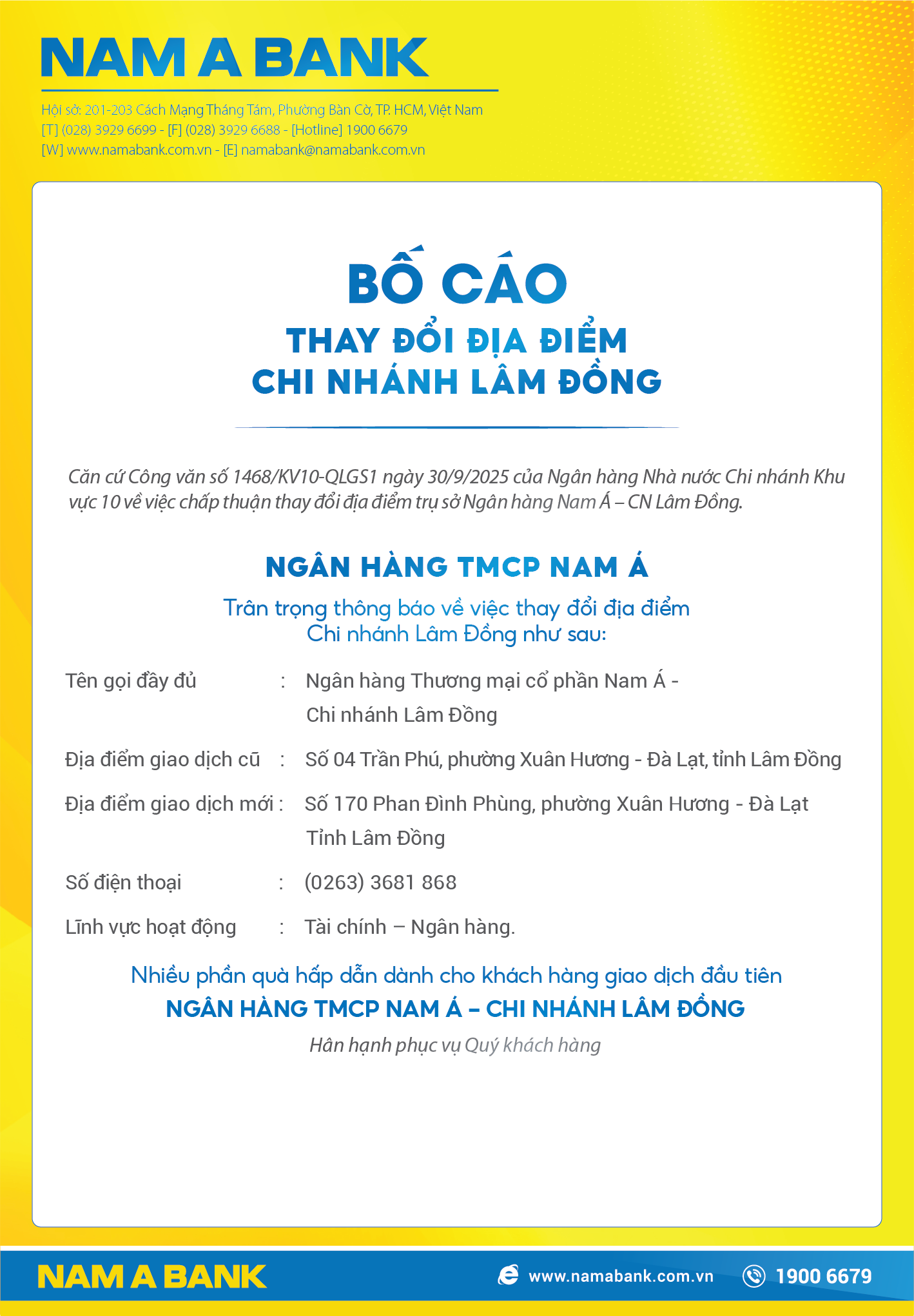 BỐ CÁO THAY ĐỔI ĐỊA ĐIỂM NAM A BANK - CN LÂM ĐỒNG