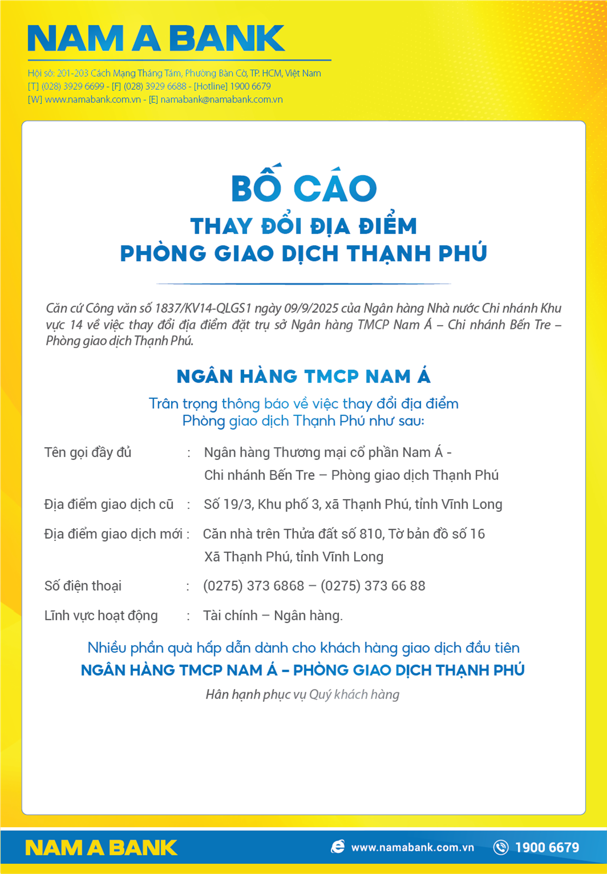 BỐ CÁO THAY ĐỔI ĐỊA ĐIỂM NAM A BANK - PGD THẠNH PHÚ