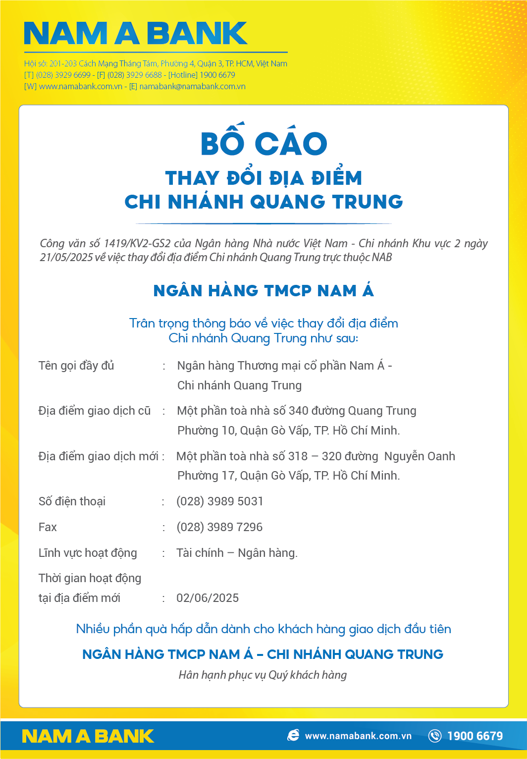 BỐ CÁO THAY ĐỔI ĐỊA ĐIỂM NAM A BANK QUANG TRUNG