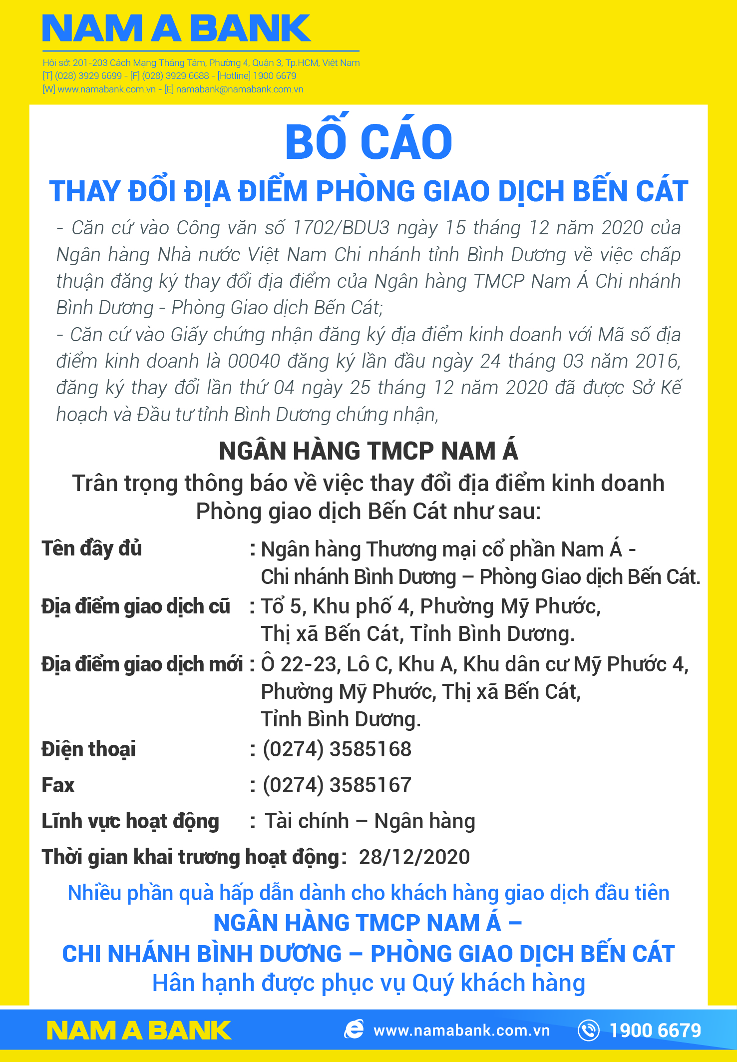 BỐ CÁO THAY ĐỔI ĐỊA ĐIỂM NAM A BANK - PGD ĐỨC TRỌNG