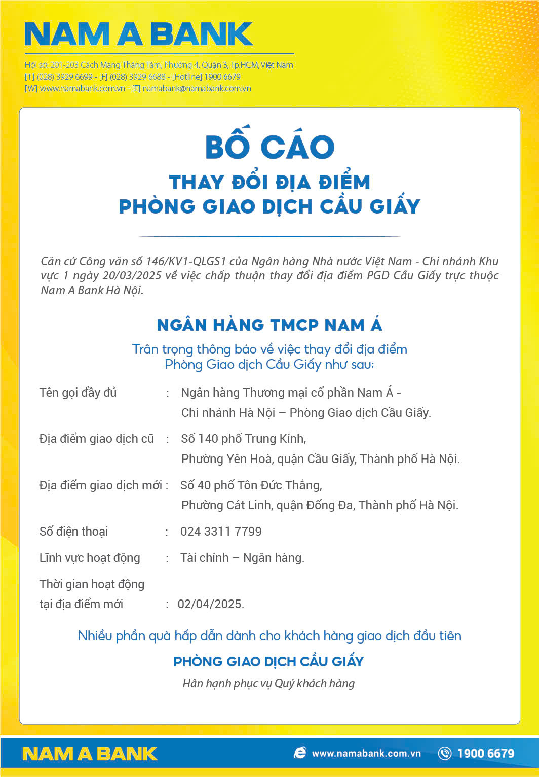 BỐ CÁO THAY ĐỔI ĐỊA ĐIỂM NAM A BANK - PGD ĐỨC TRỌNG