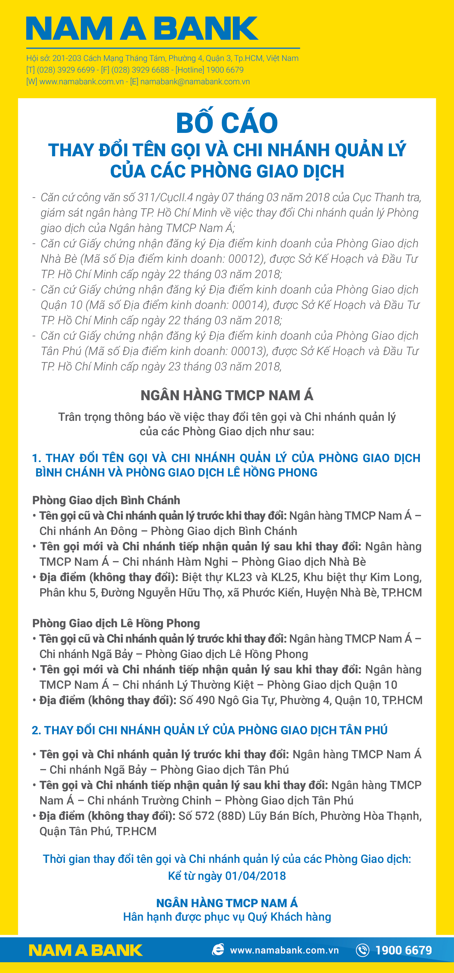 Bố cáo thay đổi tên gọi và chi nhánh quản lý của các Phòng giao dịch