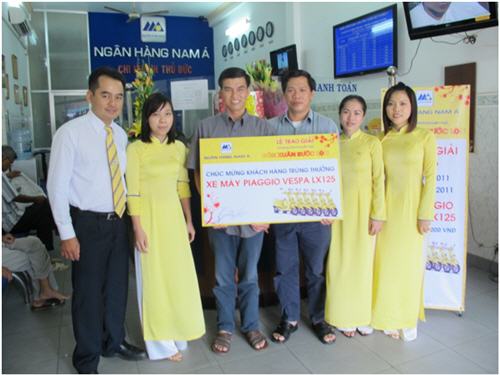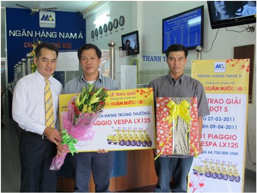 Mới đây ngày 22/04/2011, tại NAM A BANK – Chi nhánh Thủ Đức đã tổ chức trao giải Đợt 5 cho khách hàng Nguyễn Văn Tâm may mắn trúng 01 chiếc Piaggio Vespa LX125 thứ năm của chương trình khuyến mại “Đón xuân – Rước lộc”. Ông Tâm đã không giấu được niềm vui sướng và chia sẻ niềm vui ấy ngay tại buổi trao giải với bạn bè và toàn thể nhân viên NAM A BANK – CN Thủ Đức.