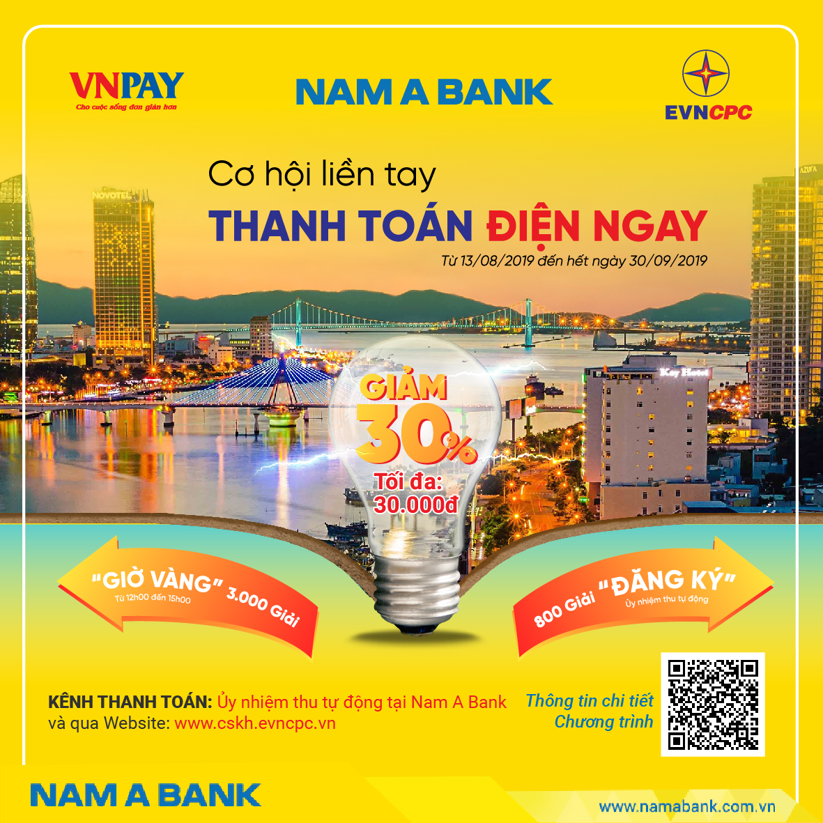 Hoàn 30% (tối đa 30.000 đồng) cho 800 khách hàng đầu tiên đăng ký mới UNTTĐ tiền điện tại Nam A Bank và có phát sinh giao dịch thanh toán tiền điện qua VNPAY trong thời gian diễn ra chương trình.