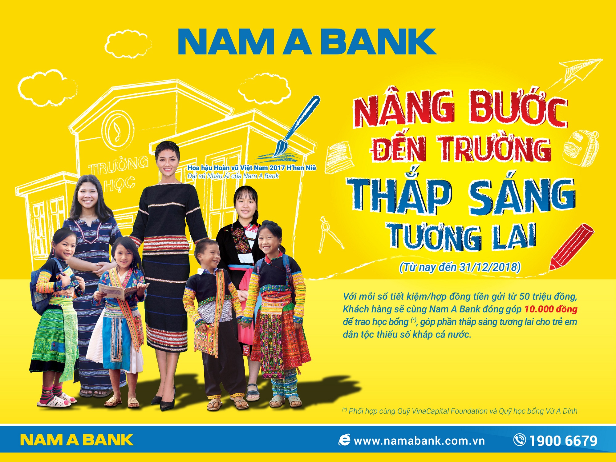 Từ nay đến 31/12, Nam A Bank triển khai chương trình “Nâng bước đến trường – Thắp sáng tương lai”. Theo đó, với mỗi Sổ Tiết Kiệm hoặc Hợp Đồng Tiền Gửi từ 50 triệu đồng được mở, Khách hàng sẽ đồng hành cùng Nam A Bank và Hoa hậu H’Hen Niê nâng bước cho các em học sinh dân tộc thiểu số khắp cả nước được đến trường.