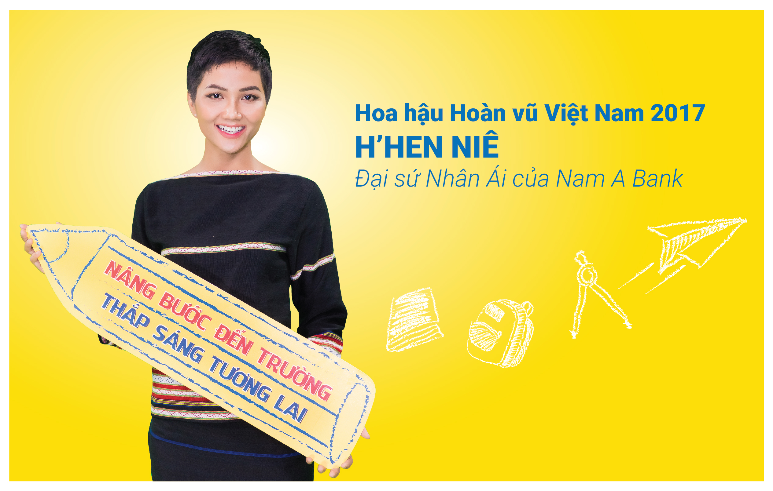 Là “Đại sứ nhân ái” trong các hoạt động cộng đồng của Nam A Bank, Hoa hậu Hoàn vũ Việt Nam 2017 H’Hen Niê không giấu được sự hào hứng khi đồng hành cùng chương trình ý nghĩa này: “Lớn lên trong cộng đồng dân tộc Ê Đê còn lắm khó khăn, H’Hen Niê may mắn được cha mẹ cho đi học đầy đủ và đạt những thành công như ngày hôm nay. Với Hen, giáo dục là con đường ngắn nhất giúp học sinh dân tộc có thể thay đổi cuộc sống của mình. Và “Nâng bước đến trường – Thắp sáng tương lai” của Nam A Bank là một chương trình đầy ý nghĩa, góp phần chắp cánh cho ước mơ đến trường của các em. Và sẽ không trọn vẹn nếu thiếu đi sự chung tay của tất cả chúng ta, do đó, H’Hen Niê hi vọng Khách hàng cũng sẽ đồng hành cùng Hen và Nam A Bank để giúp các em vẽ nên tương lai tươi sáng của chính mình.”