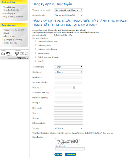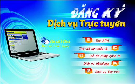 Với nền tảng công nghệ hiện đại có sẵn, chỉ với 1 thao tác click chuột là khách hàng có thể đăng ký sử dụng thẻ ATM, thẻ ghi nợ quốc tế, thẻ tín dụng quốc tế, các dịch vụ Ngân hàng điện tử và dịch vụ vay vốn của Nam A Bank. Trong vòng 24 tiếng sau khi nhận được đơn đăng ký trực tuyến của Quý khách, nhân viên Nam A Bank sẽ liên hệ để hoàn tất thủ tục. Khách hàng đã có tài khoản tại Nam A Bank hay khách hàng mới chưa có tài khoản tại ngân hàng đều có thể làm thao tác đăng ký .