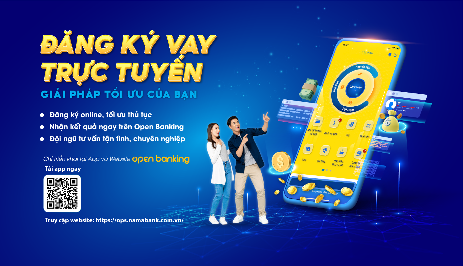 1. Giới thiệu chung: Đăng ký vay trực tuyến là tính năng giúp Khách hàng đăng ký nhu cầu vay vốn với Nam A Bank và nhận thông báo kết quả ngay trên Open Banking.