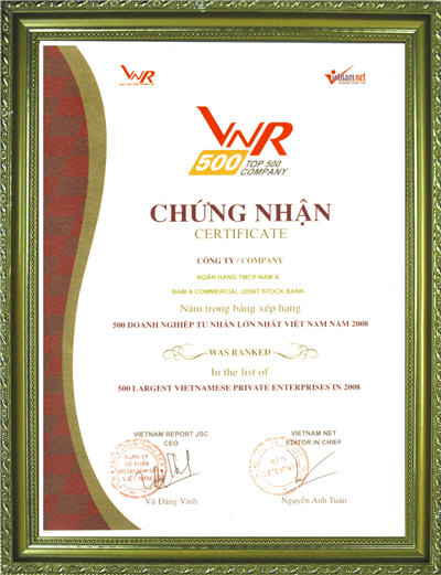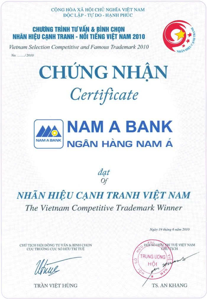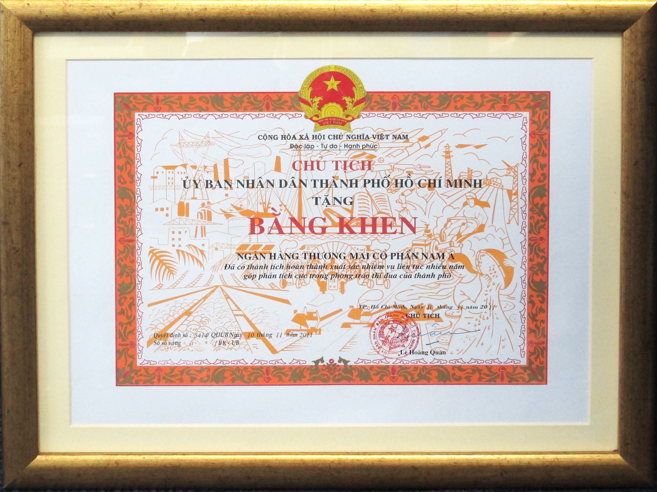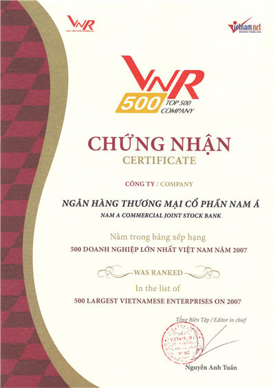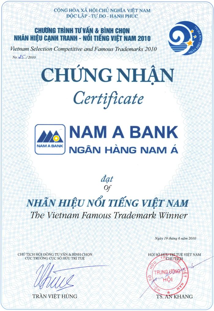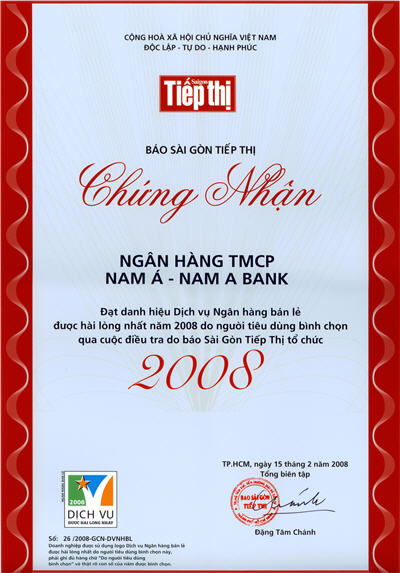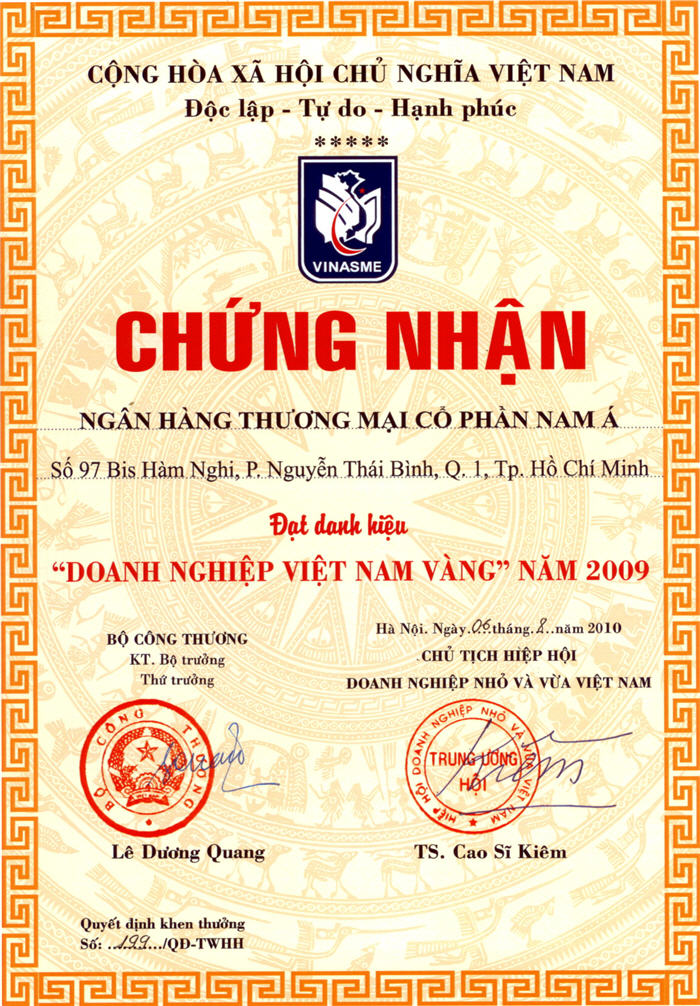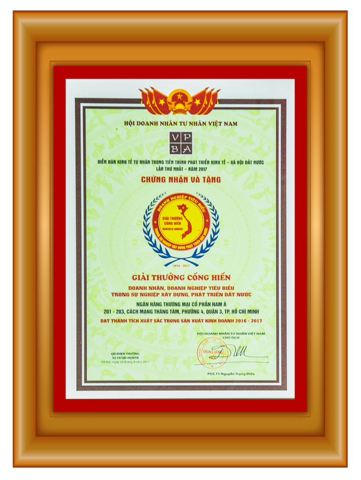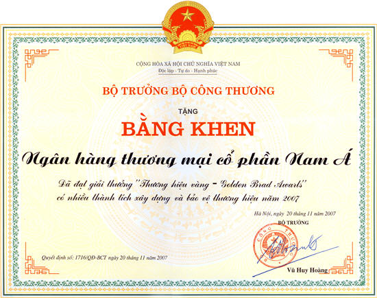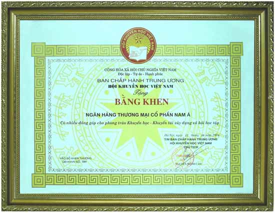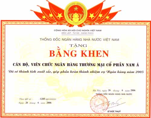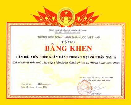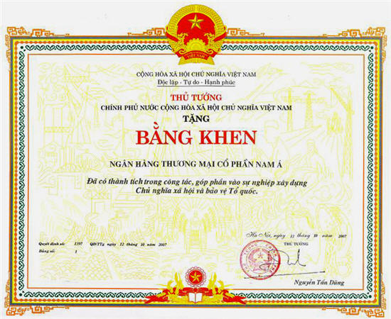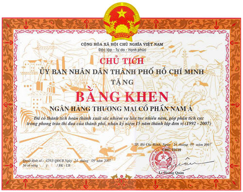 Bằng khen: Chủ tịch UBND thành phố Hồ Chí Minh trao tặng "Ngân hàng TMCP Nam Á đã có thành tích xuất sắc nhiệm vụ liên tục nhiều năm góp phần tích cực phong trào thi đua của thành phố"