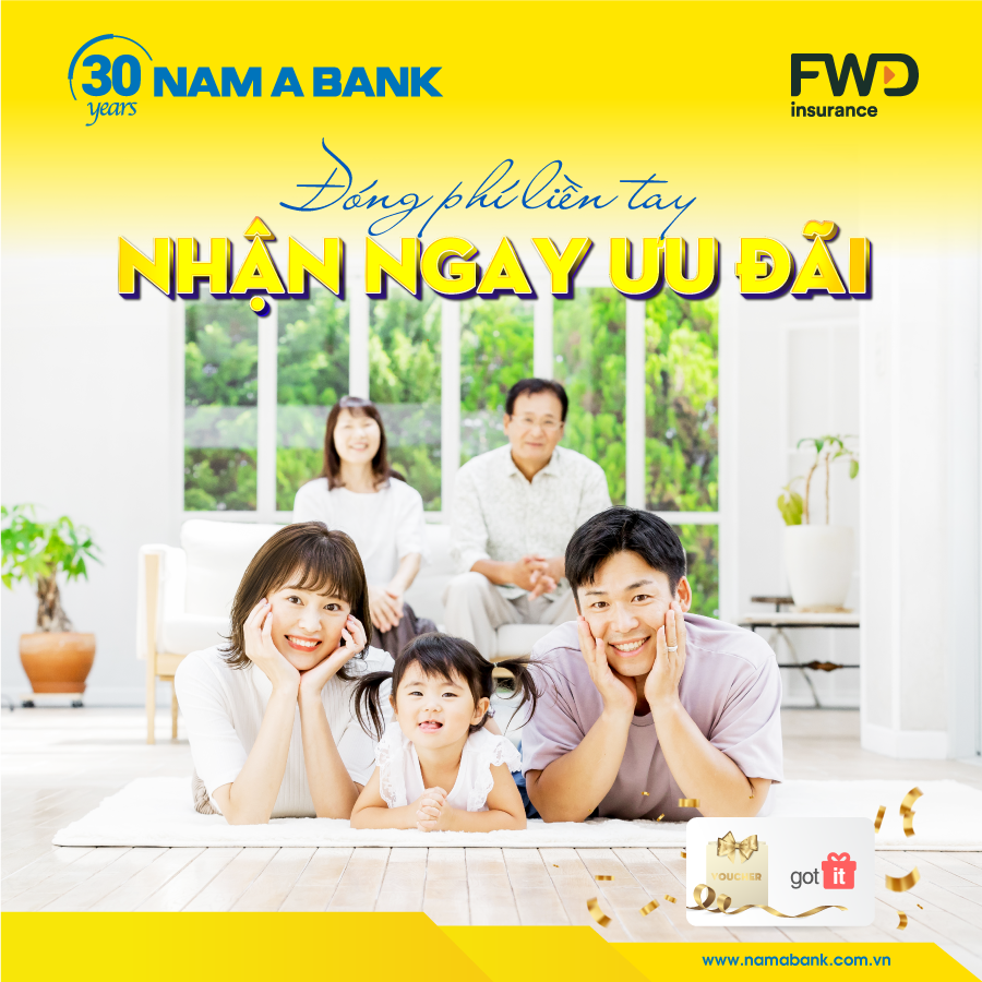 Từ ngày 15/6 đến hết 30/6/2022, khách hàng của NAM A BANK đóng phí năm thứ 2 của hợp đồng bảo hiểm của đối tác FWD Việt Nam sẽ được tặng ngay phiếu quà tặng giá trị lên đến 5 triệu đồng tương ứng với số phí bảo hiểm tham gia.