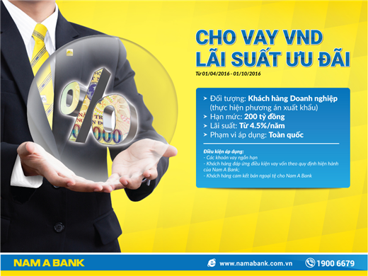 Bên cạnh đó, Nam A Bank còn hướng đến việc tiếp cận các doanh nghiệp xuất khẩu khi giới thiệu chương trình “Cho vay VND lãi suất ưu đãi”. Việc Thông tư 24/2015 của Ngân hàng Nhà nước có hiệu lực từ ngày 01/04/2016 khiến nhu cầu vay vốn VND lãi suất thấp của các doanh nghiệp xuất khẩu cao hơn bao giờ hết.