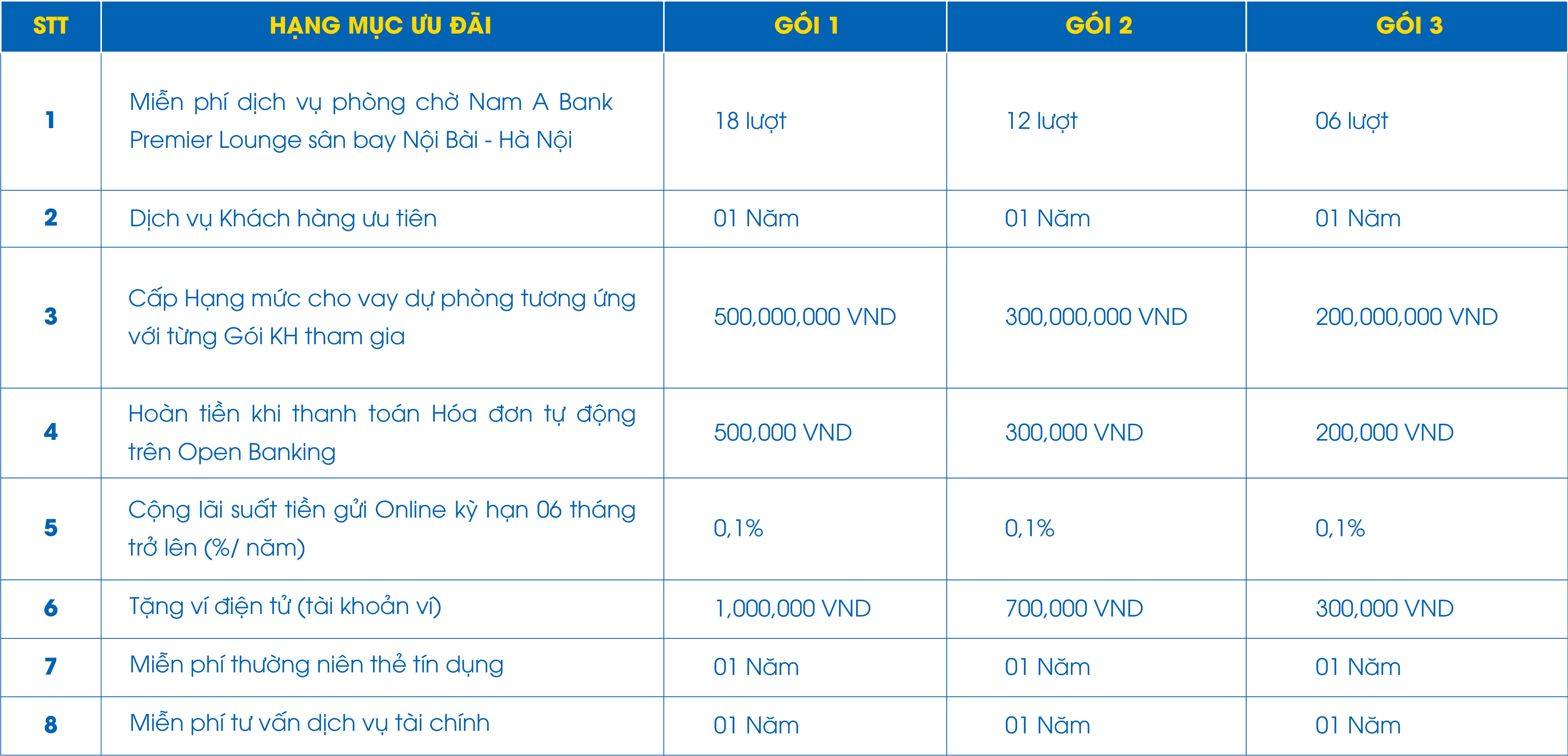 👉 Sở hữu mức giá phù hợp cho từng gói tài khoản của Happy Account, khách hàng có thể dễ dàng đăng ký để sử dụng các đặc quyền đẳng cấp tại Nam A Bank.