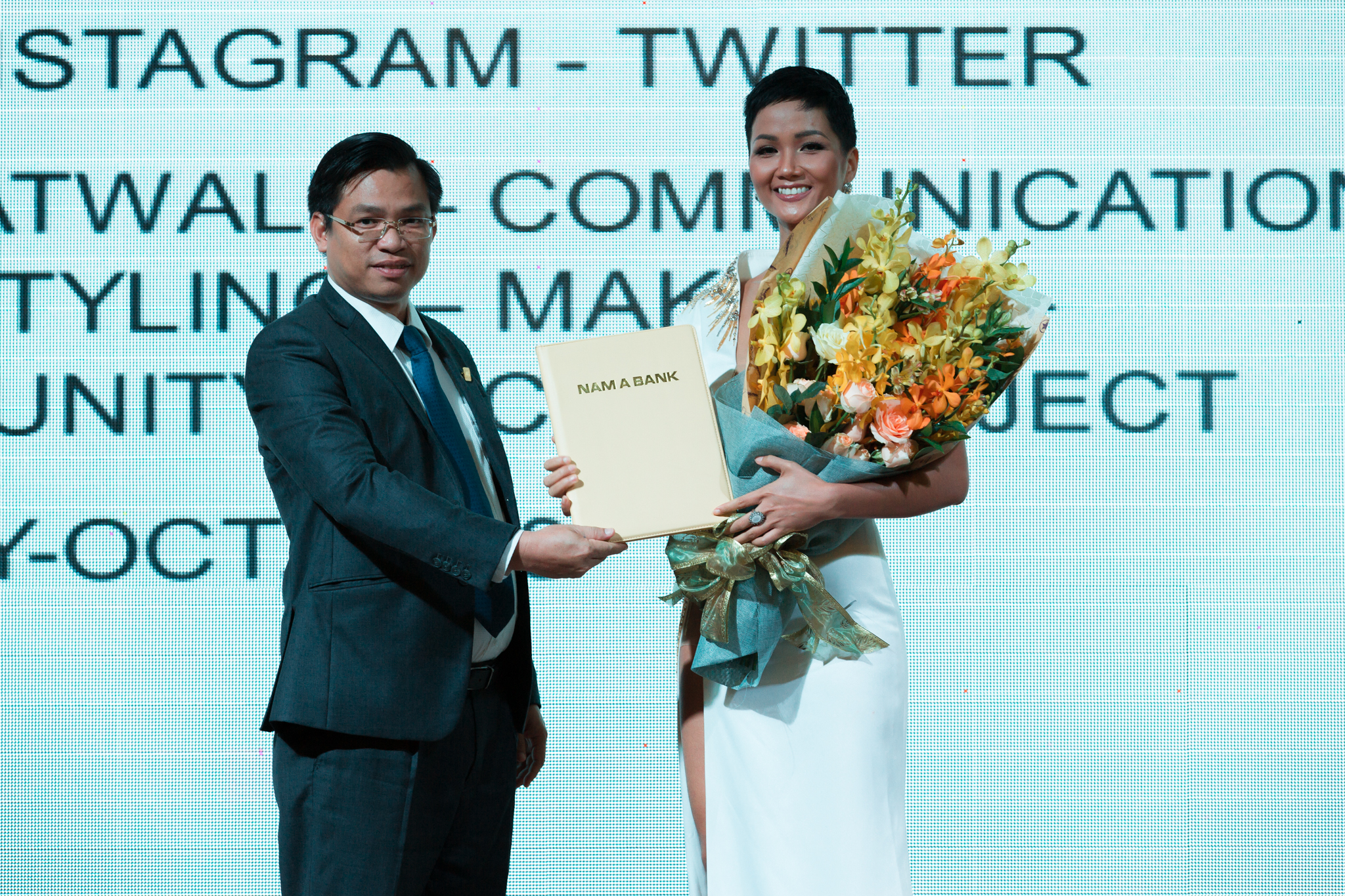 Ông Trần Ngọc Tâm – Quyền Tổng Giám đốc Nam A Bank công bố Hoa hậu Hoàn vũ Việt Nam 2017 H’Hen Niê trở thành Đại sứ nhân ái trong các hoạt động cộng đồng của Ngân hàng.