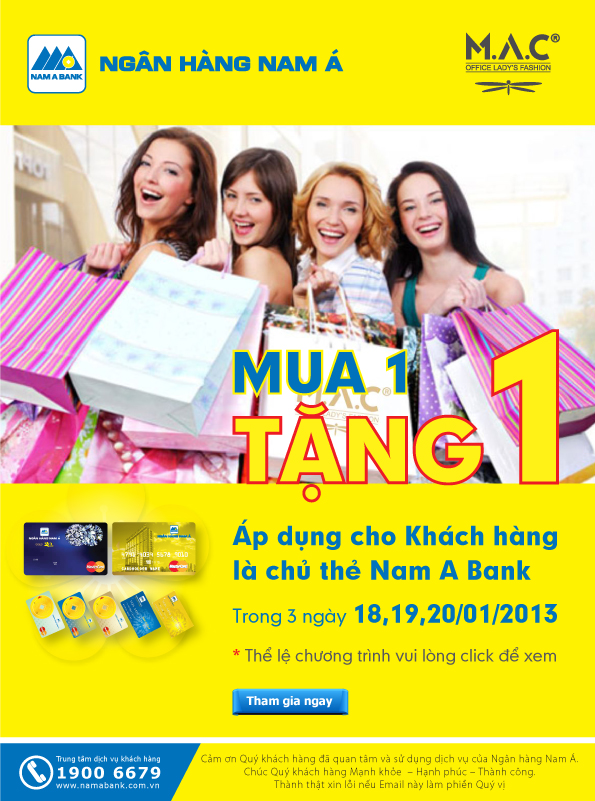 Khách hàng  thanh toán bằng tất cả loại Thẻ do Ngân hàng Nam Á phát hành sẽ nhận ưu đãi : Mua 1 tặng 1 chỉ trong 03 ngày 18,19,20 tháng 01 năm 2013 tại Hệ thống MAC SHOP trên toàn quốc.