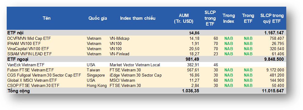 Fubon FTSE Vietnam ETF và VanEck Vectors Vietnam ETF (VNM ETF) là hai quỹ ETF có quy mô lớn đầu tư vào thị trường chứng khoán Việt Nam. Ngoài hai quỹ này, hiện còn có các quỹ ETF đến từ Singapore, Đài Loan, Hongkong, Mỹ và các quỹ ETF nội như DCVFMVN Mid Cap ETF, Vina Capital VN 100 ETP… đầu tư vào cổ phiếu NAB.