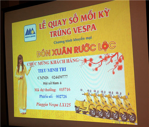 Vào ngày 02/03/2011, NAM A BANK sẽ tiếp tục tổ chức Lễ quay số Đợt 2 với giải thưởng là 01 chiếc Piaggio Vespa LX 125 dành cho các mã số dự thưởng của khách hàng tham gia Chương trình “Đón xuân – Rước lộc” (từ ngày 13/02/2011 đến ngày 26/02/2011).
