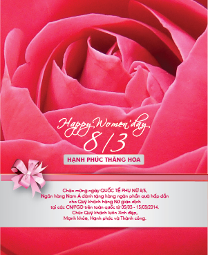 Hãy gửi những lời chúc tốt đẹp nhất, những tình cảm chân thành nhất đến một nữa của Thế Giới nhân ngày Quốc tế phụ nữ 08/03. Thay cho những lời chúc, Ngân hàng Nam Á (NAM A BANK) dành tặng hàng ngàn phần quà hấp dẫn cho khách hàng nữ đến giao dịch tại các CN/PGD của Nam A Bank trên toàn quốc với lời nhắn nhủ “Hạnh phúc thăng hoa” như một lời chúc mãi mãi hạnh phúc bên gia đình và người thân.