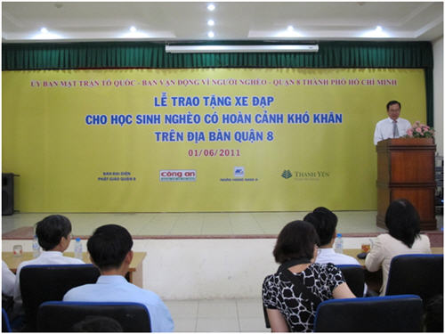 Nhân dịp ngày Quốc tế thiếu nhi 01/06, Ban thường trực Ủy ban Mặt trận Tổ quốc, Ban vận động “Vì người nghèo” quận 8 tổ chức Lễ trao tặng xe đạp cho học sinh nghèo có hoàn cảnh khó khăn trên địa bàn quận với sự tham gia tài trợ của Báo Công An Thành phố Hồ Chí Minh kết hợp với Ngân hàng TMCP Nam Á (NAM A BANK), cùng các tổ chức và đơn vị có lòng hảo tâm khác.