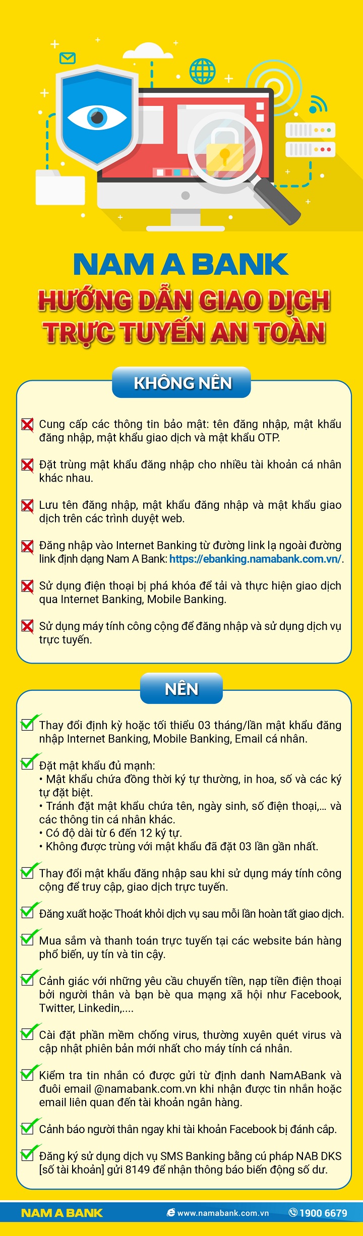 Nhằm đảm bảo an toàn và bảo mật khi sử dụng dịch vụ Ngân hàng Điện tử cũng như phòng tránh những rủi ro trong giao dịch trực tuyến, Nam A Bank hướng dẫn và khuyến khích khách hàng tham khảo những thông tin dưới đây: