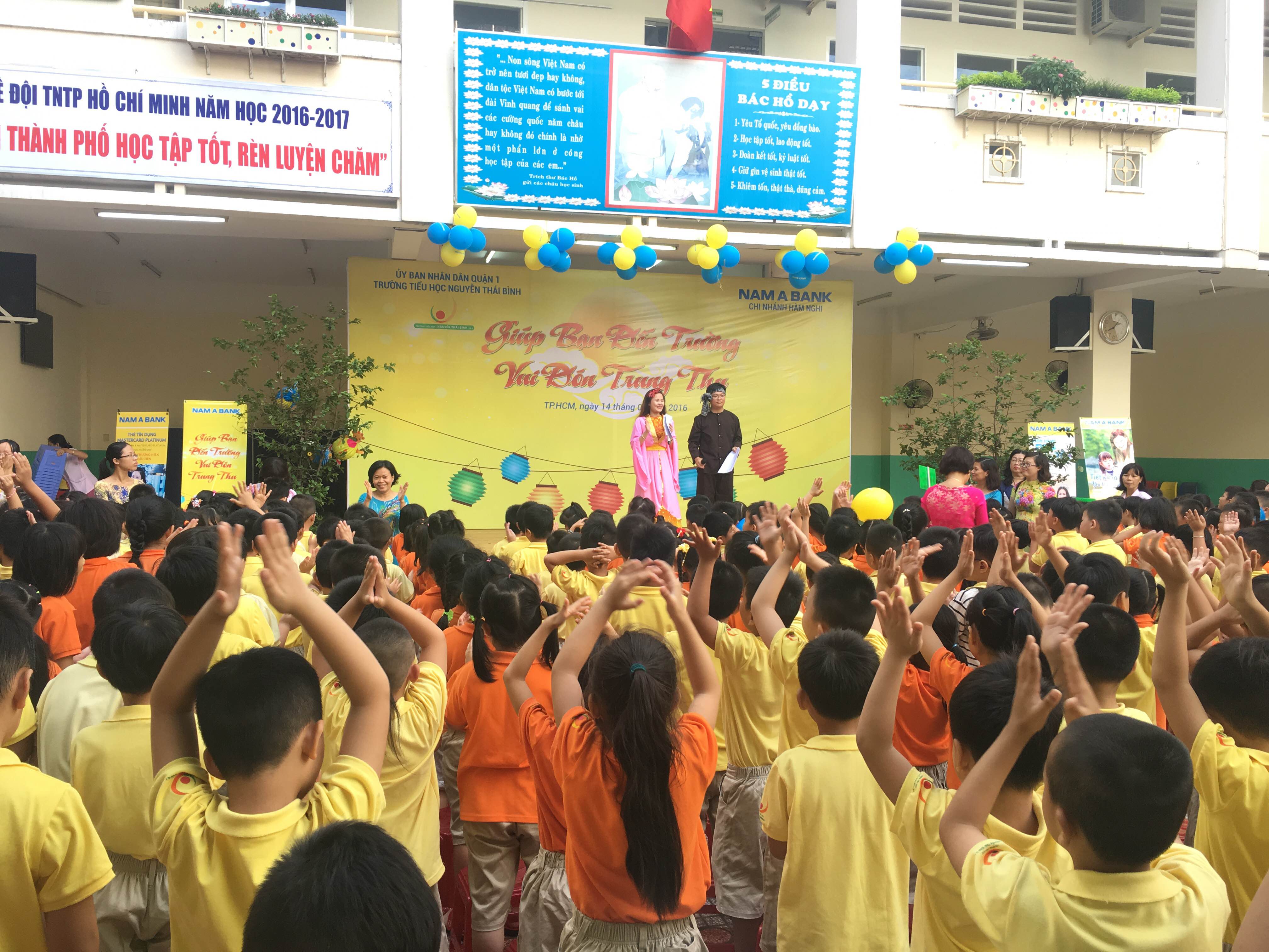 Các em nhỏ tại trường tiểu học có vẻ vô cùng hào hứng khi được gặp chị Hằng chú Cuội từ Nam A Bank Hàm Nghi.