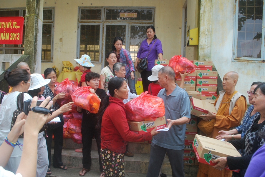 Tại xã Hoài Tân, tỉnh Bình Định đoàn đã trao cho hơn 100 phần quà với nhiều chăn, màn, thức ăn, thuốc uống phòng ngừa cho những ngày mưa lũ.